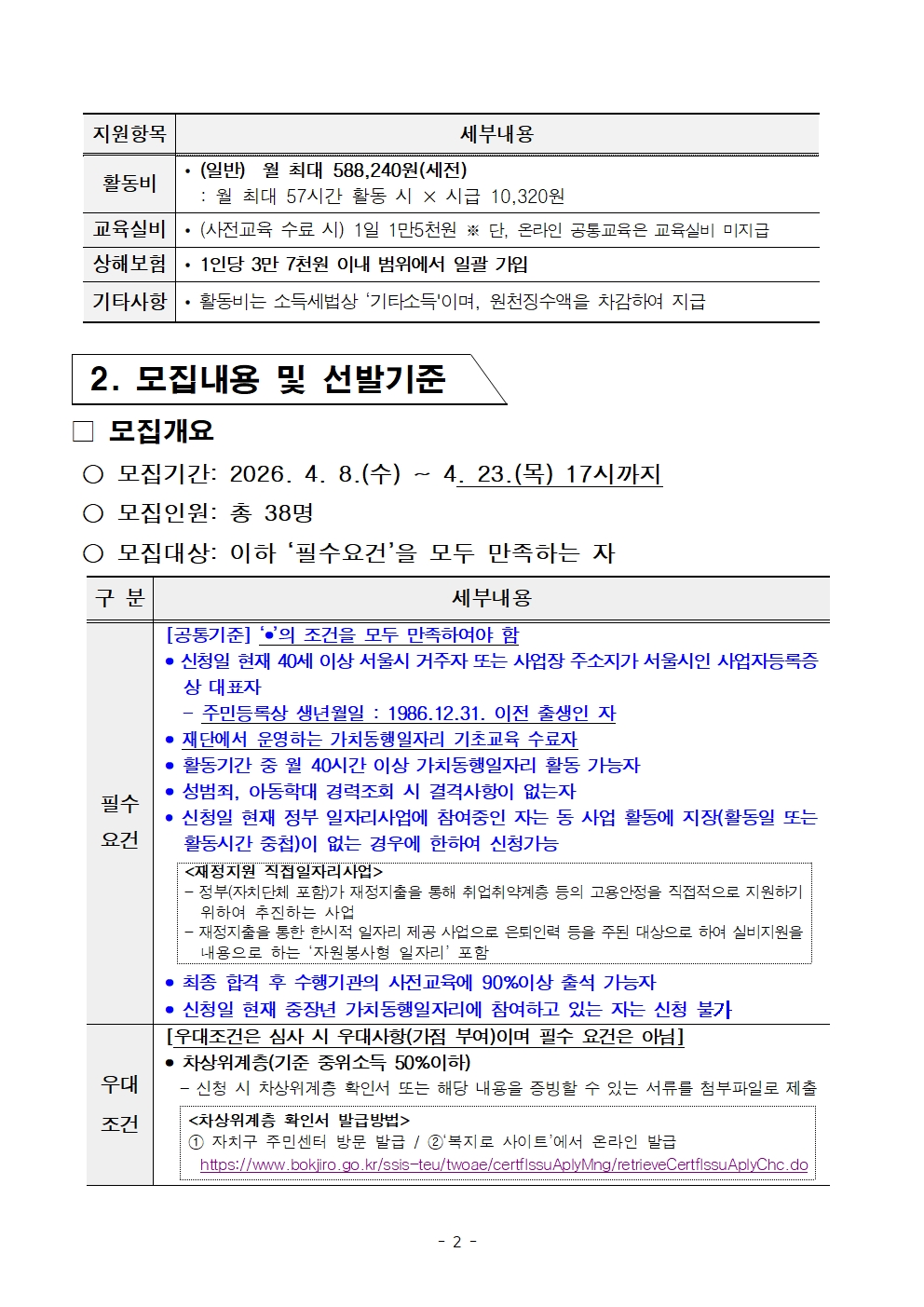2. 고립가구 발굴(협의체 회의 참석, 동주민센터 방문홍보 등) 야외 활동으로 체력에 이상 없는 인원 선호