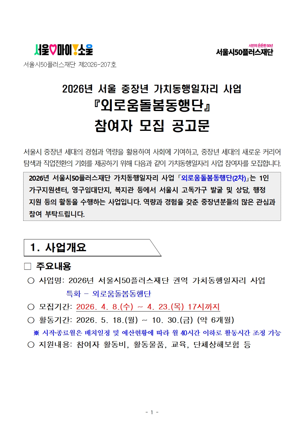 2026년 서울 중장년 가치동행일자리 사업 2차 공동모집_특화-외로움돌봄동행단