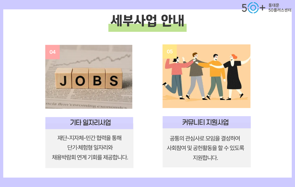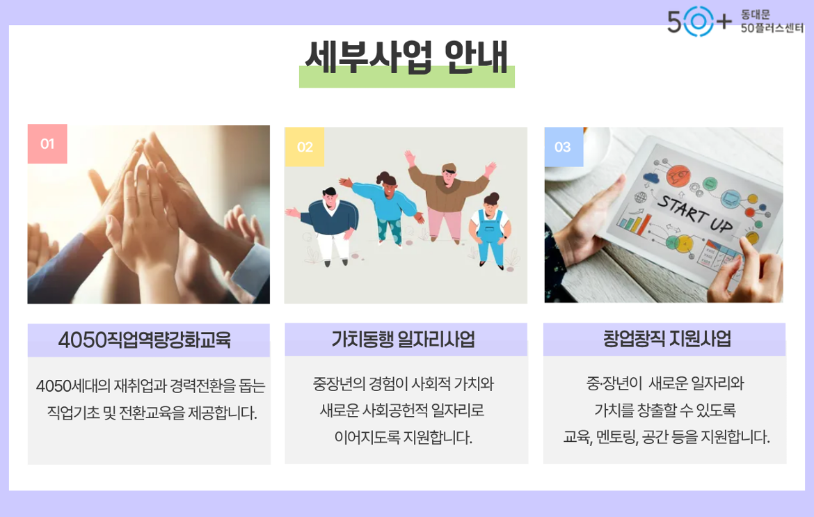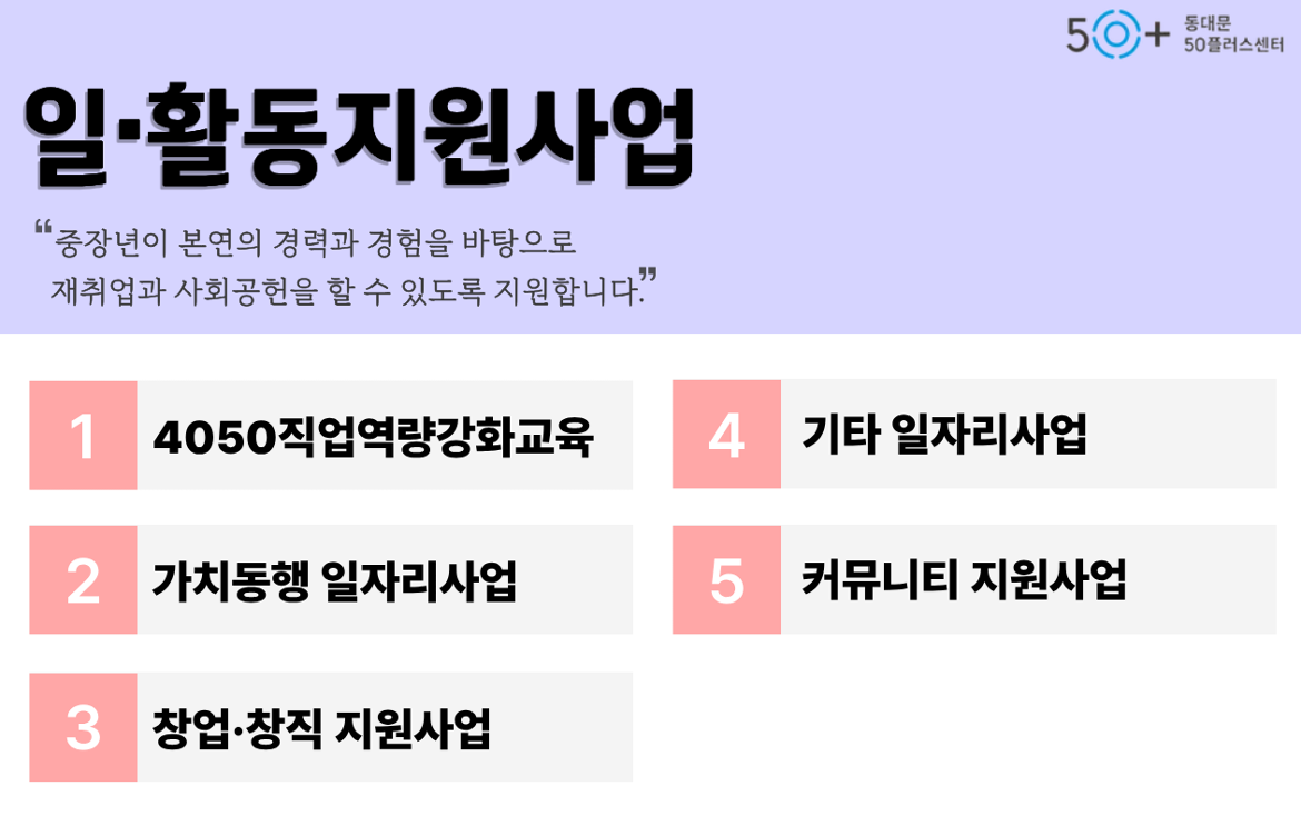 동대문50플러스센터 서울특별시 동대문구 외대역동로5길 18 사업자등록번호 : 174-82-81708