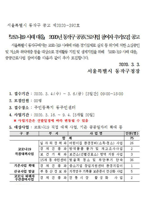 [코로나 19 사태 대응] 2020년 동작구 공공근로사업 참여자 추가모집 공고