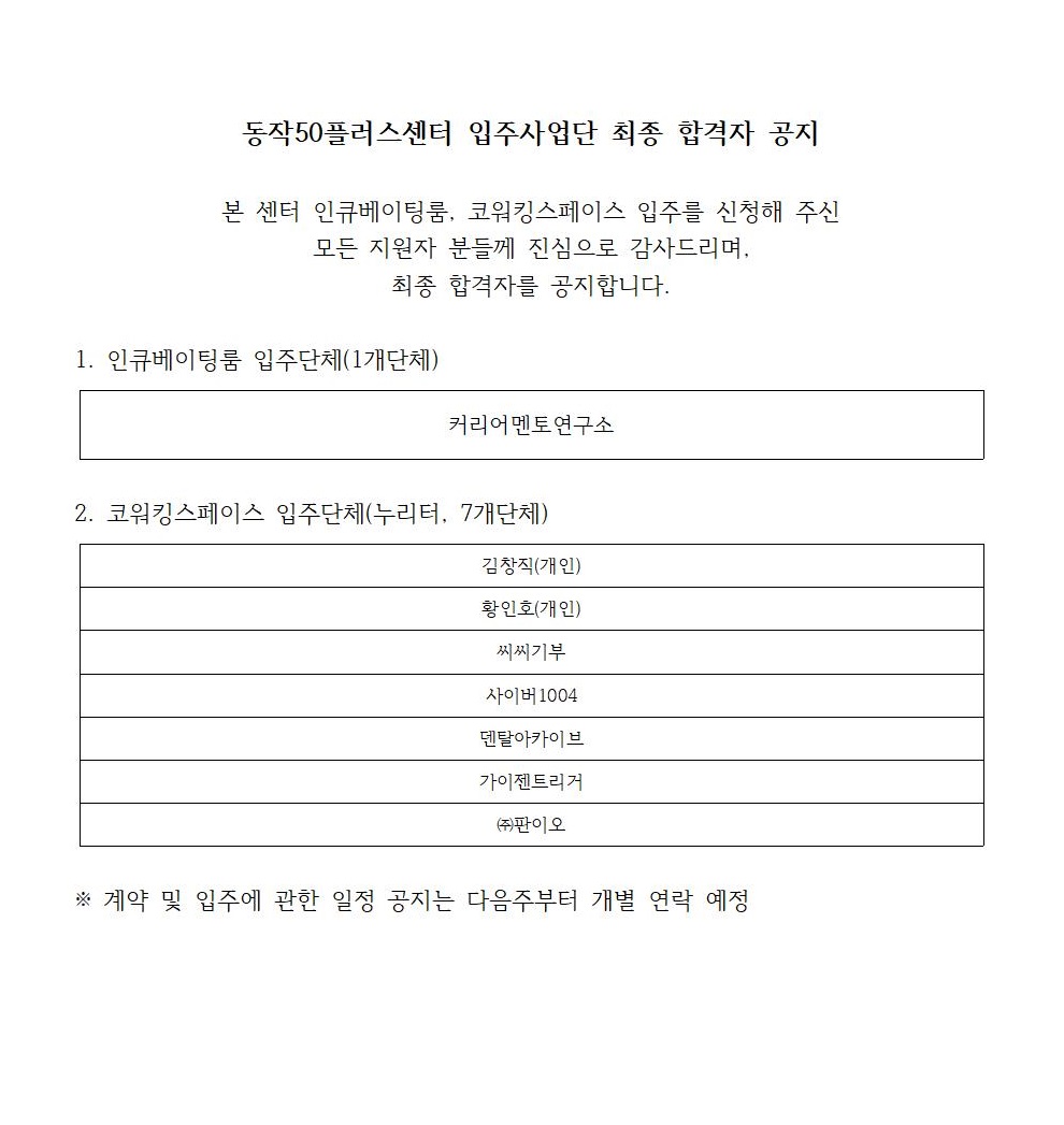 서울시 동작센터 | 2020년 상반기 입주사업단 최종결과 발표