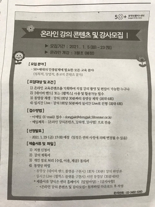 2021년 1월 18일(월) 동작뉴스에 <온라인 강의 콘텐츠 및 강사모집>이 실렸습니다.