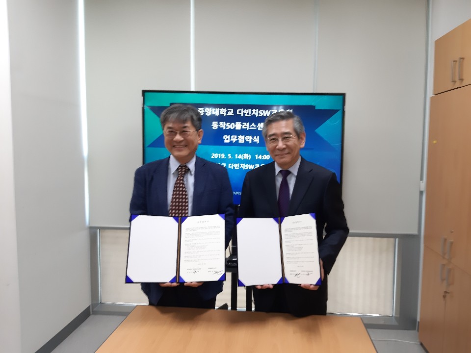 동작50플러스센터(센터장 최병훈;사진 우)와 중앙대학교 다빈치SW교육원(교육원장 윤경현;사진 좌)은 지난 5월 14일(화) 14:00 중앙대학교 다빈치SW교육원장실에서, 중장년층(50~64세)을 대상으로, 제2인생설계 및 일자리사업 등 제반 업무에 대한 상호협력을 내용으로 하는 업무협약을 맺었다.