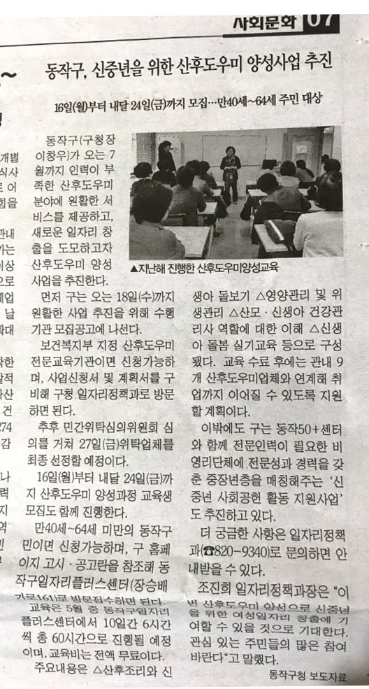 (동작뉴스 3월 1일자) 동작구, 신중년을 위한 산후 도우미 양성사업 추진 기사 하단에