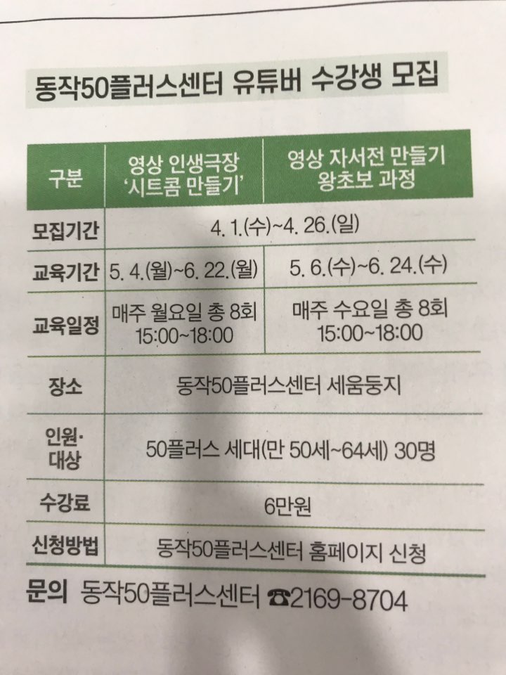(인터넷 동작뉴스 3월 28일 자)동작50플러스센터에서는 유튜버 되기 수업 수강생 모집을 한다.