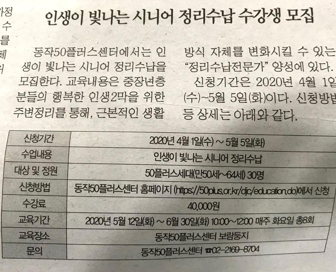 (동작뉴스 4월 16일자 지면)동작50플러스센터에서는 인생이 빛나는 시니어 정리수납을 모집한다.