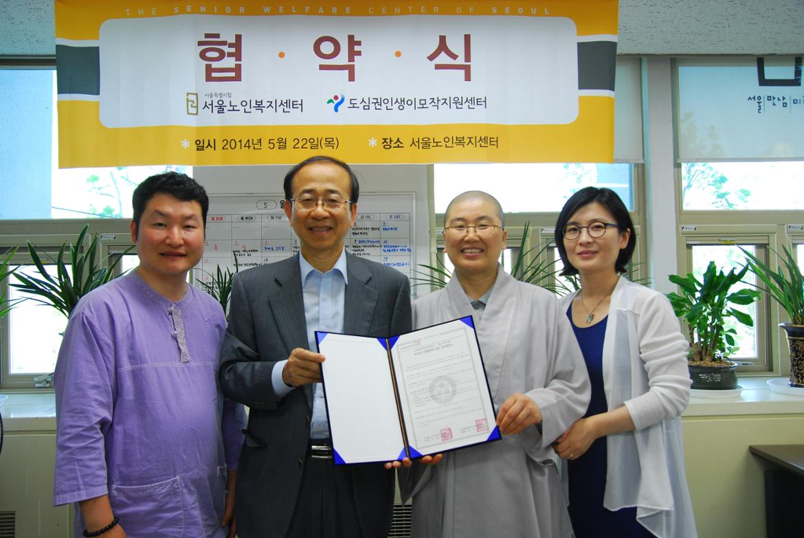 도심권인생이모작지원센터가 2014년 5월 22일 인근에 있는 서울노인복지센터와협약을 체결하였습니다. 서울노인복지센터는 도심권인생이모작지원센터 1층 활짝작은도서관을 맡아 운영하게되며 그 이외에도 다양한 사업을 같이 진행할예정입니다.