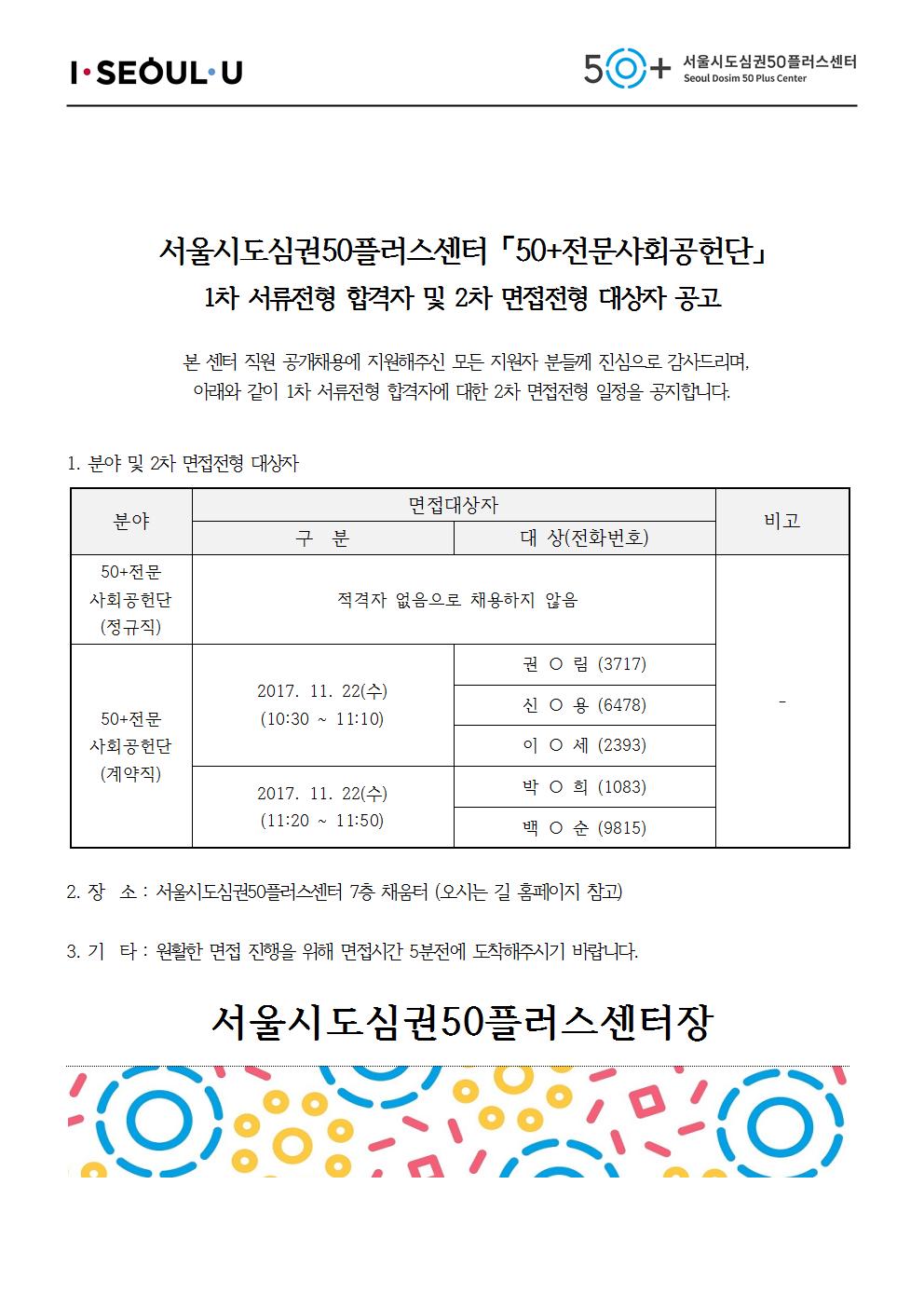 [채용]서울시도심권50플러스센터 직원채용 2차 면접대상자 공고