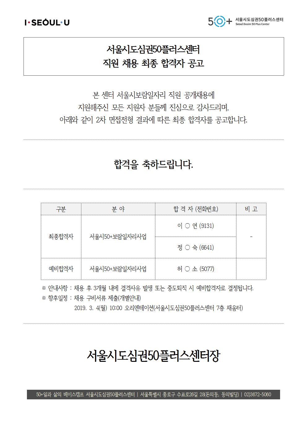 [채용] 서울시도심권50플러스센터 직원채용 최종합격자 공고