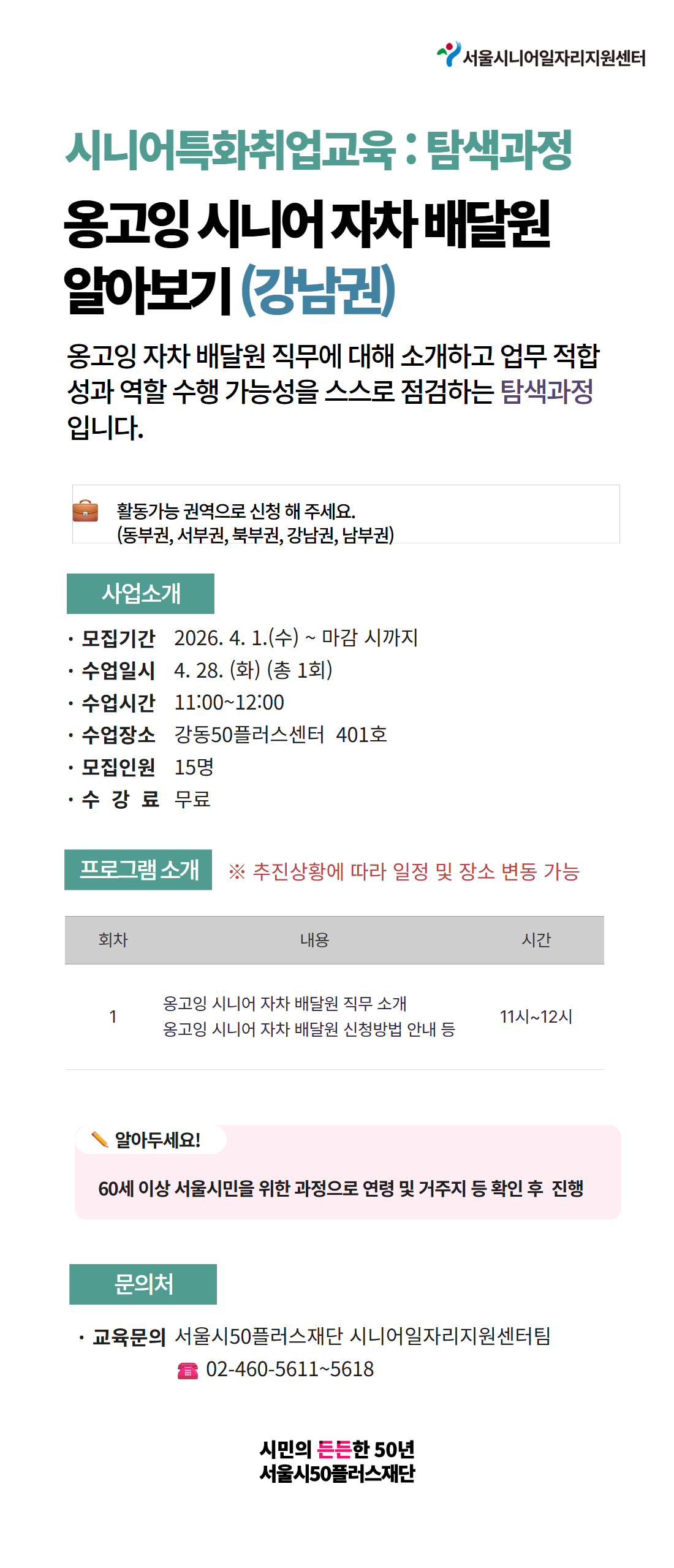 강동50플러스센터 401호 시니어일자리지원센터 -옹고잉 시니어 자차 배달원 직무 소개 -옹고잉 시니어 자차 배달원 신청방법 안내 등 없음
