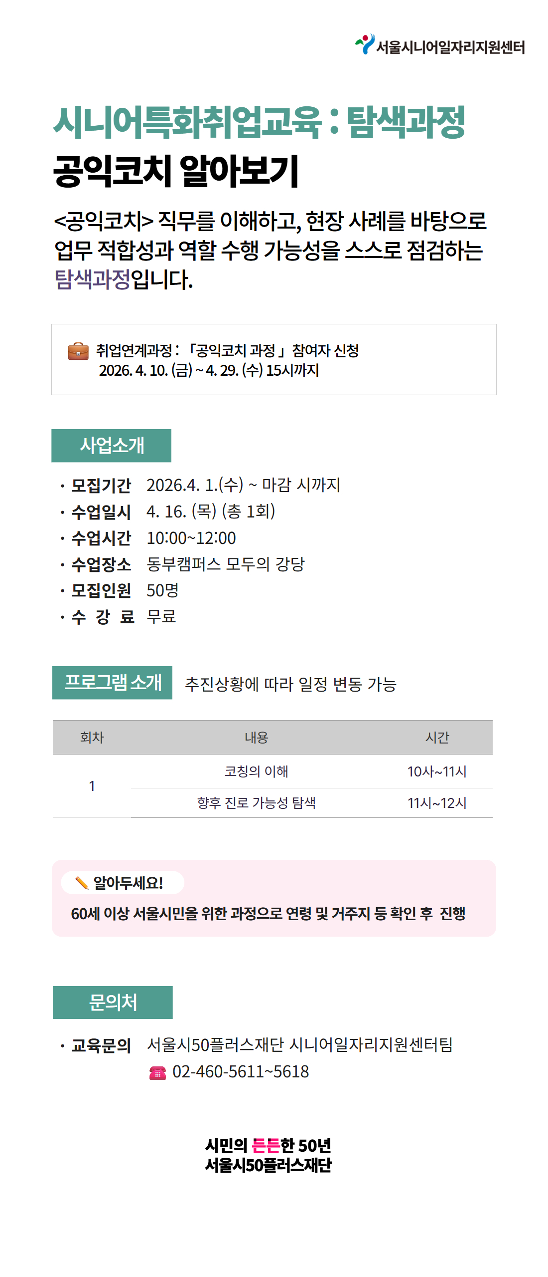 [시니어일자리지원][시니어 특화 취업교육] 직무탐색: 공익코치 알아보기마감 D-13