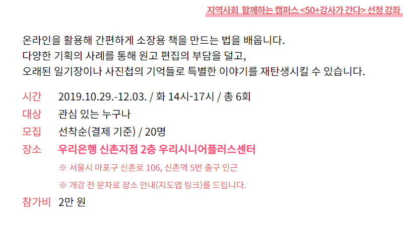 우리은행 신촌지점(2층) | 김정수 | 50+의 출판사례 소개 | 없음 |