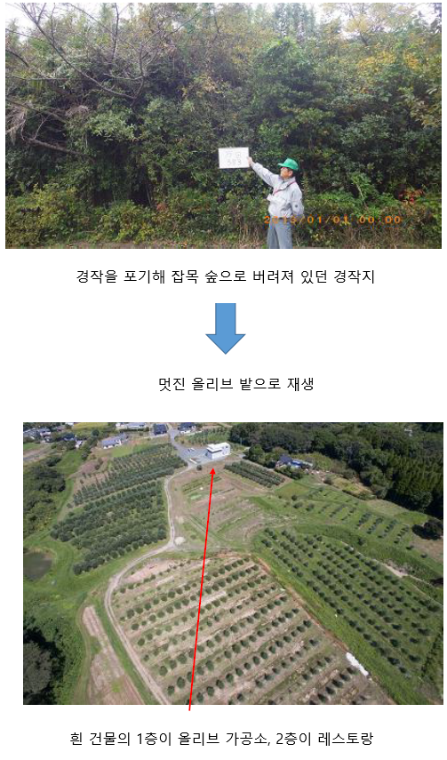 나카가와 씨가 올리브밭을 만들고 싶다고 생각한 이유는 하나 더 있다. 전업농가였던 본가의 토지가 손을 대지 않아 황폐해진 채로 내버려져 있었다. 본가는 전매공사와 계약하여 엽연초를 재배했다. 그러나 부모님이 연세가 많아져 농사일을 할 수 없게 되면서 밭은 경작을 포기한 채 버려져 있었다. 인접한 농지도 마찬가지여서, 주변은 40년 이상 방치되어 대나무 숲이나 잡목 숲으로 변해 있었다.그것을 구글의 항공사진으로 보니, 경사는 있지만, 남향이라 햇빛을 많이 받는 땅이었다. 그렇다면 해외에서 본 와이너리와 같은 마음 편하게 즐길 수 있는 공간으로 만들 수 없을까? 그렇게 생각하기 시작한 것은 10년 정도 전이었다. 회사원 생활을 하면서 머릿속에는 착착 구상이 이루어지고 있었다. 인접지의 매입과 개간 농원 부지는 약 4만 제곱미터(12,000평). 약 반은 나카가와 씨의 토지이지만, 나머지 반은 경작을 포기하고 있던 땅 주인들이 인수해달라고 요청을 해서 사들인 토지이다. 토지가 정리되자 그다음은 개간작업을 했다. 개간은 58세에 시작해 햇수로 3년 걸렸다. 그 사이에 국내 와이너리를 방문하여 조사를 거듭했다. 포도를 심고 나서 수확까지는 시간이 걸리고, 양조 기술이나 설비 투자에 상당한 자금이 필요하다는 것을 알았다. 그래서 와인을 하기는 어렵다는 결론을 얻었고 올리브밭으로 하기로 마음을 바꾸었다.일본에서 올리브로 유명한 쇼도시마에 가서 여러 가지를 물어보니, 올리브 재배만으로는 채산이 맞지 않는다고 하였다. 그래서 올리브 재배뿐만 아니라, 올리브유의 맛을 알리기 위해 가공 판매와 음식이라는 3가지를 중심으로 사업을 하기로 했다.