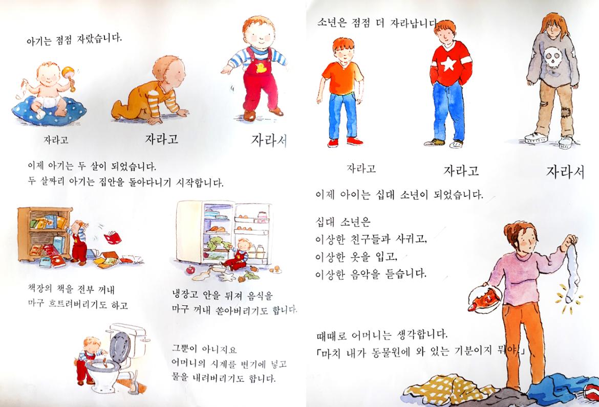 너는 크고 나는 늙는 구나 며칠 전, 조카며느리가 페이스북에 이런 짧은 글과 함께 4월에 태어난 둘째 사진을 몇 장 올렸다. 아기가 너~무 예뻐서 “우~~와앙~~” 소리가 절로 나면서도 조카며느리에 대한 애잔한 맘이 들었다. 그러면서 엄마들의 애환과 사랑을 담은 이 그림책이 떠올랐다.