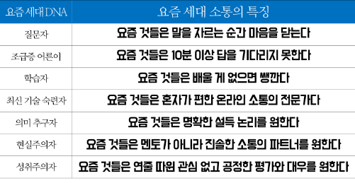 첫째, 질문자인 요즘 것들은 말을 자르는 순간 마음을 닫는다. 자유롭게 말할 수 있는 분위기가 아니면, 그들은 얘기하지 않는다. 둘째, 조급증 어른이인 요즘 것들은 10분 이상 답을 기다리지 않는다. 셋째, 학습자인 요즘 것들은 배울 게 없으면 무시한다. 소위 말해서, ‘쌩깐다’는 것이다. 넷째, 최신기술 숙련자인 요즘 것들은 혼자가 편한 온라인 소통 전문가이다. 다섯째, 의미추구자인 요즘 것들은 명확한 설득 논리를 원한다. 여섯째, 현실주의자인 요즘 것들은 멘토가 아니라 진솔한 소통의 파트너를 원한다. 일곱째, 성취주의자인 요즘 것들은 연줄 따윈 관심 없고 공정한 평가와 대우를 원한다.