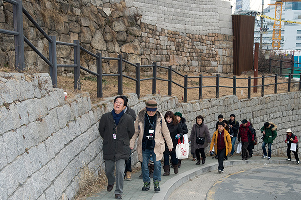 ▲전우용 교수와 함께 성곽길을 걷는 브라보 투어 참가자들.