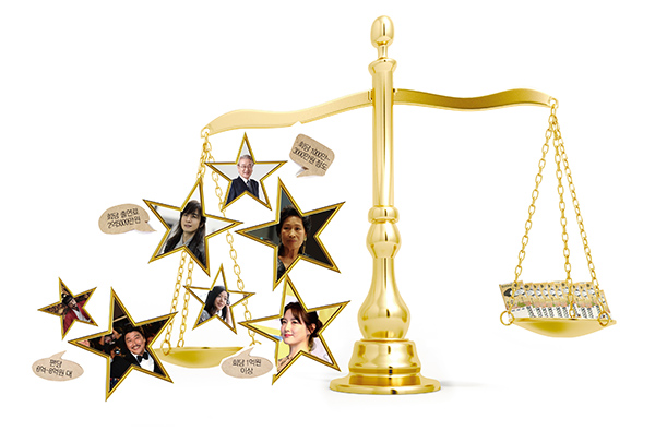 중국 한류 팬이 물었다. 한국 드라마에는 편부와 편모 가정이 많이 등장하는데 실제도 그러냐고. 한 드라마 제작사 대표가 하소연했다. 스타 한 사람이 드라마 회당 출연료로 1억~2억 원 넘게 요구하고 저작권 수익 20퍼센트를 보장해달라고 하니 어떻게 드라마를 만드느냐고. 한 네티즌이 질문했다. 한류스타들이 출연하는 중국 영화 출연료가 10억원이 넘는다는 보도가 나오는데 사실이냐고. 30년 연기자로서 살아온 50대 중견 연기자가 강조한다. 한국방송연기자노동조합에 소속된 4000여명의 연기자 중 70퍼센트가 연 소득(2014년 기준)이 1020만원 미만이고 방송에 단 한 번도 출연하지 못해 출연료 수입이 전혀 없는 경우도 30퍼센트라고. 스타와 연기자들의 몸값 일면을 보여주는 언급들이다.