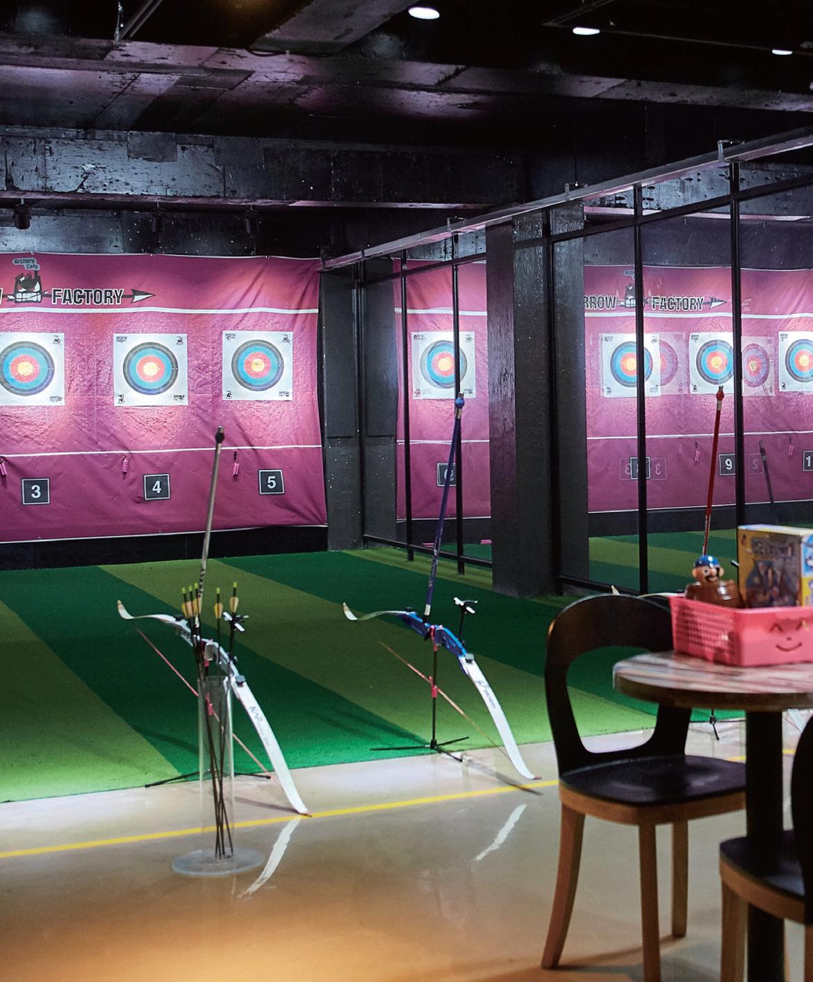 양궁카페는 그대로 양궁장과 카페가 합쳐진 곳으로 커피나 음료를 마시면서 양궁을 즐길 있는 공간이다. 선수들이 주로 70m 거리에서 경기를 한다면 양궁카페는 실제 양궁장의 크기를 축소해 일반인들도 접근하기 쉽게 만들었다. 애로우팩토리 홍대점의 경우 과녁까지의 거리는 약 10m. 초보자도 연습하면 쉽게 과녁에 화살을 꽂을 있다. 레저 카페답게 간단히 먹을 있는 과자와 음료도 진열되어 있다. 원하는 간식을 집어 결제하면 끝! 밖에서 음식을 사와도 된다. 단 음주는 불가능하다. 애로우팩토리 이용요금은 30발에 1만 원, 1시간에 1만5000원, 평일 종일권 3만5000원이다. 애로우팩토리 이동우 사장은 초보자라면 시간제를, 경험이 있으면 화살 개수로 체험할 것을 추천했다.