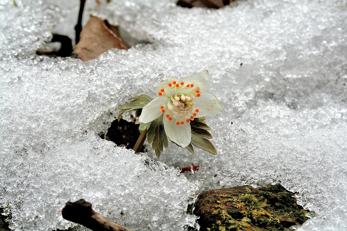 특히 복수초 등의 설중화는 꽃이 핀 다음 살짝?내린 눈으로 만들어지는 데 반해, 너도바람꽃은 두껍게 쌓인?눈을 헤집고 올라온, 진정한 의미의 ‘눈속의 꽃(雪中花)’으로 피어나는 걸 볼 수 있습니다. 4월에도 눈이 내리는 경기, 강원의 깊은 산에선 눈 속에 묻혔던 너도바람꽃이 다시 고개를 드는 경이로운 광경도 만날 수 있습니다.