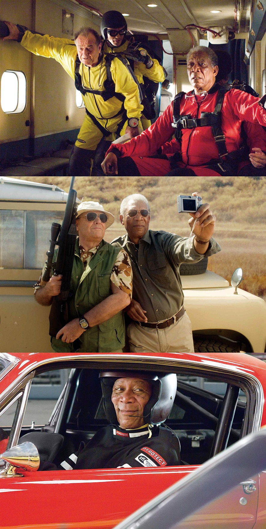 ▲영화 <버킷리스트>에서 스카이다이빙하기, 아프리카 초원에서 사냥하기, 카레이서 되기 등 소원을 이루어나가