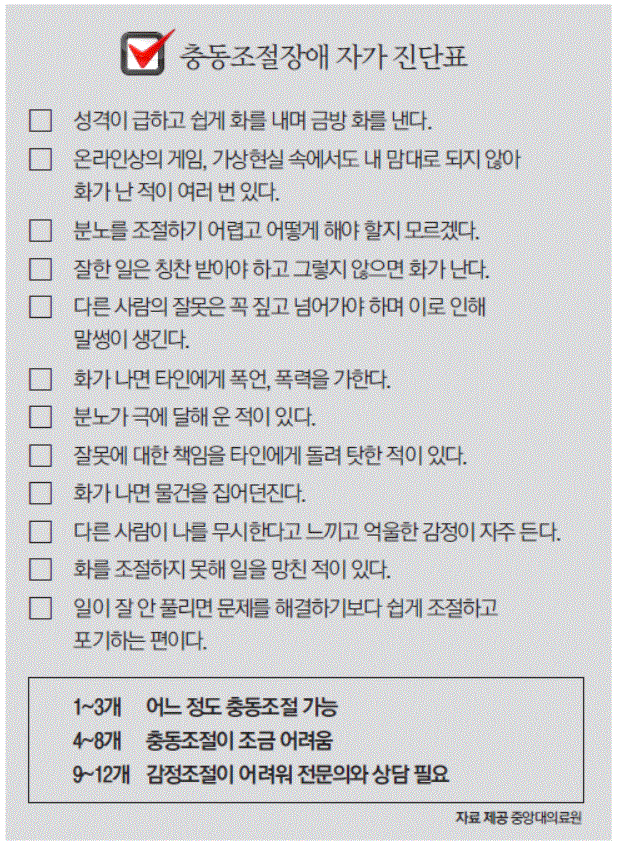 흔히 일반적으로 분노조절장애 혹은 분노충동조절장애라고 부르는 이 질병을 의학계에서는 충동조절장애라고 이야기한다.