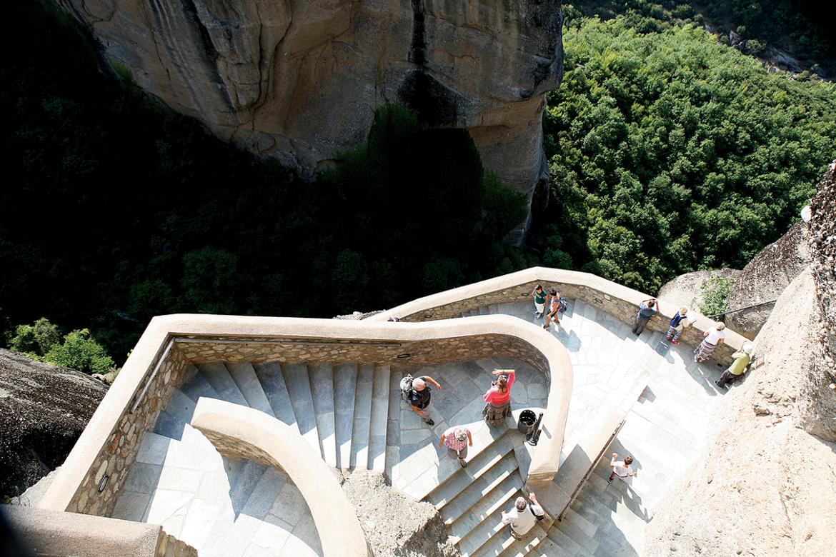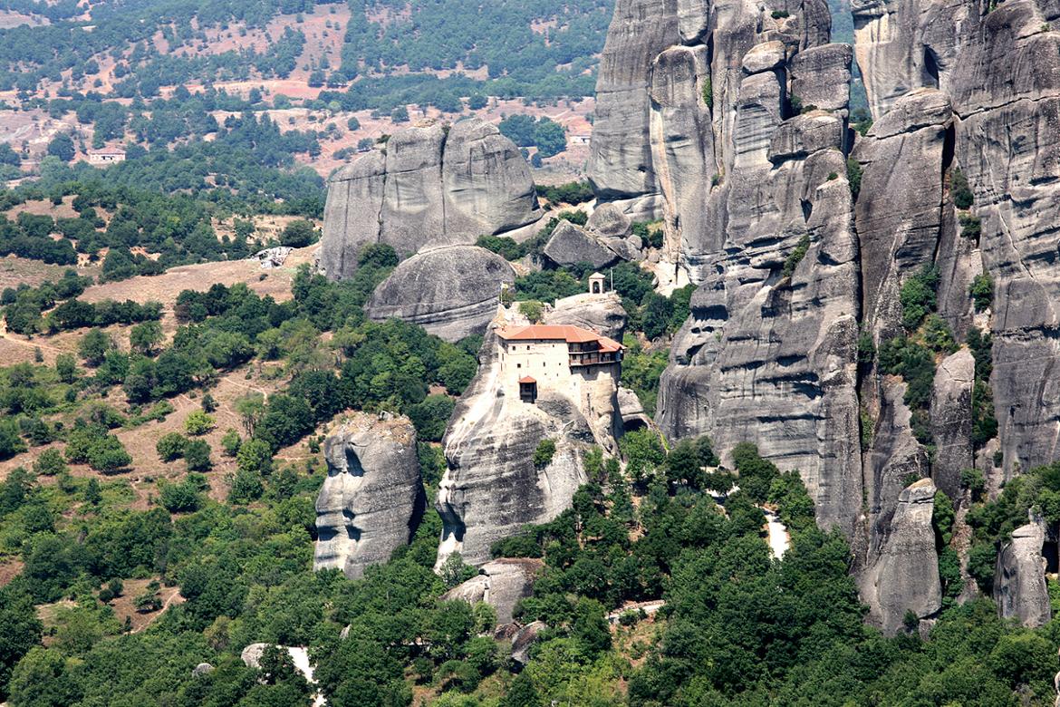 그리스 여행 중에서 메테오라를 빼놓는다면 여행의 재미 하나를 잃어버린다 해도 과언이 아니다. 메테오라는 그리스어로 ‘공중에 떠 있다’라는 뜻으로 ‘하늘의 기둥(columns of the sky)’이라고 불리는 지역이다. 유네스코는 이곳의 기묘한 자연경관과 경이로운 종교 건축물의 가치를 인정해 1988년 세계복합유산으로 지정했다. 칼람바카(Kalambaka) 마을에 도착하면 우선 감탄사가 절로 나온다. 마을 뒤로 거대한 암산이 산봉우리처럼 연이어진다. 400m 이상의 바위 봉우리들은 테살리아(Thessalia) 평원에 있는 페네아스(Peneas) 계곡과 칼람바카라는 작은 도시를 에워싸고 있다. 이 봉우리들은 약 6000년 전, 강에서 원추형으로 나타났다가 지진 활동으로 변형되면서 생긴 것으로 조사되었다. 메테오라의 기암들은 사암과 역암이 강물에 의해 침식되어 생겨난 거대한 암산이다. 그것보다 더 강렬한 것은 기암 위에 지어진 수도원이다.