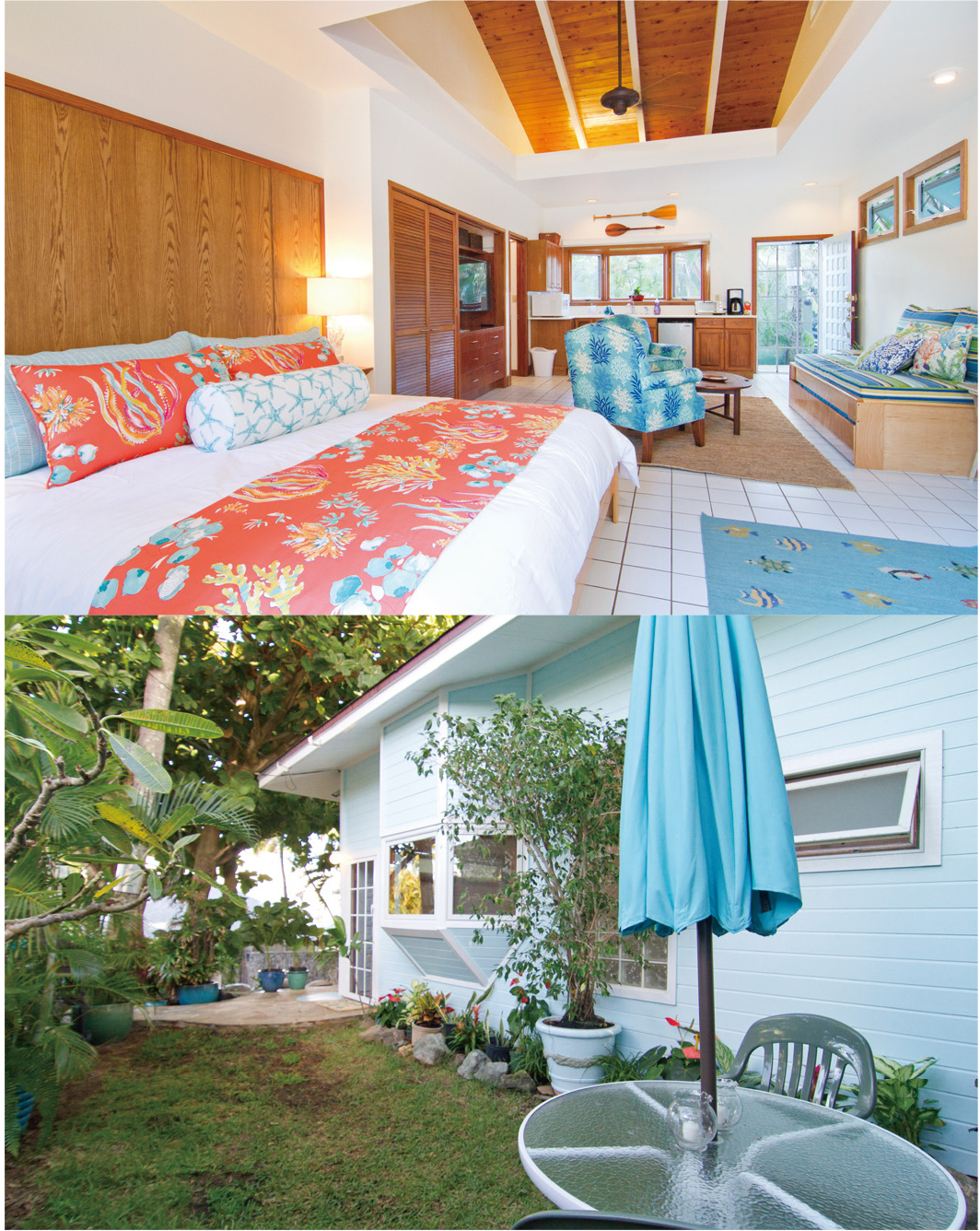 화려한 색감과 무늬가 하와이의 열대 바닷속을 연상케 하는 헬렌의 숙소는 와이키키 해변과 진주만이 있는 오아후 섬의 카네오헤에 있다. 근처 바닷가에서 생생하게 들려오는 파도 소리가 매력적인 공간. 카네오헤는 썰물 때 드러나는 작은 모래섬인 샌드바가 유명하다. 샌드바가 생기면 보트를 타고 나가 그 위에 올라서서 바다 안을 볼 수 있다. 샌드바가 잔잔하게 물에 잠기면 스노클링으로 열대어, 바다거북 등을 직접 볼 수 있다. 에어비앤비 집주인 헬렌은 내과 의사여서 혹시 건강상에 문제가 생기더라도 신속하게 조언을 구할 수 있다.