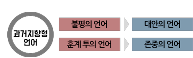 첫째,과거지향형 언어이다.현재나 미래보다는 자신이 경험한 과거의 기준과 규칙에 비추어 얘기하는 것이다.대표적인 것이 불평의 언어이다. "요즘 사람들은 말이야…" 과거를 기준으로판단하고부정적인말을 하는 것이다."이렇게 해보는 건 어때?" 젊은 세대와 소통하기 위해서는 잘못이 있다면 인정하고, 가능성을 찾아가는‘대안의 언어’를쓸 필요가 있다.과거지향형 언어의 또 하나는훈계 투의 언어이다."다 너 잘되라고 하는 소리야." 젊은 세대는 주제넘게 간섭하는 말에 예민하다.그들은 참견하는 조언자가 아니라 마치 엄마처럼 진솔한 소통의 파트너를 원한다.젊은 세대와소통하기 위해서는 동등한 입장에서 상대를 위하는‘존중의 언어’가 효과적이다.