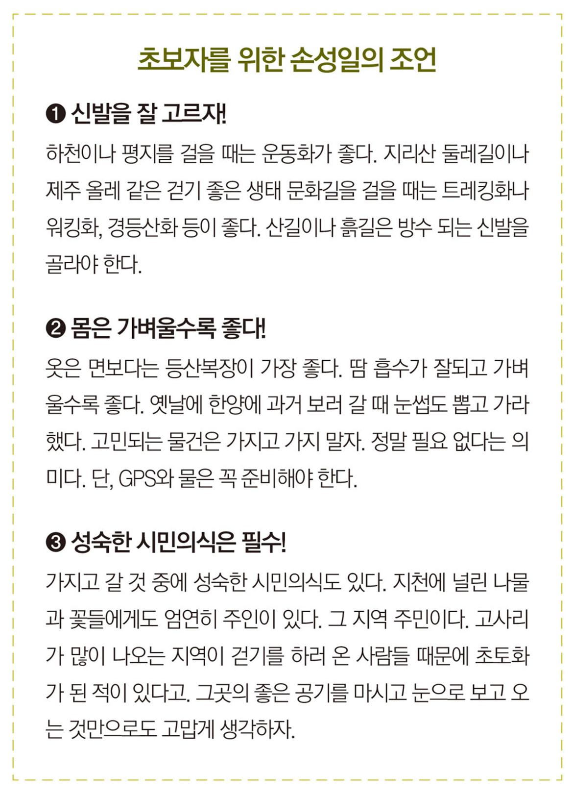 여성 화장실을 두 배 정도 만들어 달라고 지자체에 요청하고 있다. 여성들이 많이 걷고 또 걷기에 불편함이 없으면 남녀노소 누구나 걷기 편한 길이 될 거라 믿는다. 아도행과 손 대표가 만들어가는 삼남길은 제주 올레보다 난이도가 높고 지리산 둘레길보다 난이도가 조금 낮다. 어차피 70%가 산인 나라에서 길을 만들다보니까 매번 평지만을 걸을 수가 없다. 대부분의 사람들이 걷기를 하면서 대단한 감정이나 꿈을 가지고 걷지는 않는다. 그저 걷는 것만 생각한다. 그 자체가 목적이라는 뜻이다. 손 대표처럼 미래 세대와 함께할 길을 만들겠다는 사람도 있지만 대부분은 한 걸음 한 걸음에 마음을 담아 나 자신을 만나는 것에 집중하지 않을까? 손 대표는 속도와 정확성에서 좀 벗어나 세상을 바라보길 바란다고 했다. 걷는 길 위에서 좋은 소식을 듣고 평안하다면 그것만으로도 아름답지 않을까.