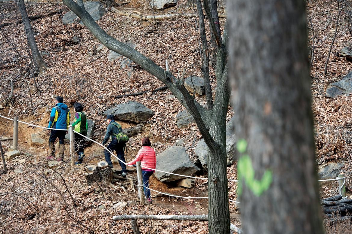 ▲봄의 길목, 아도행 회원들은 싸늘한 날씨를 이겨내며 천년 걸어다닐 길에 표시 작업을 했다.
