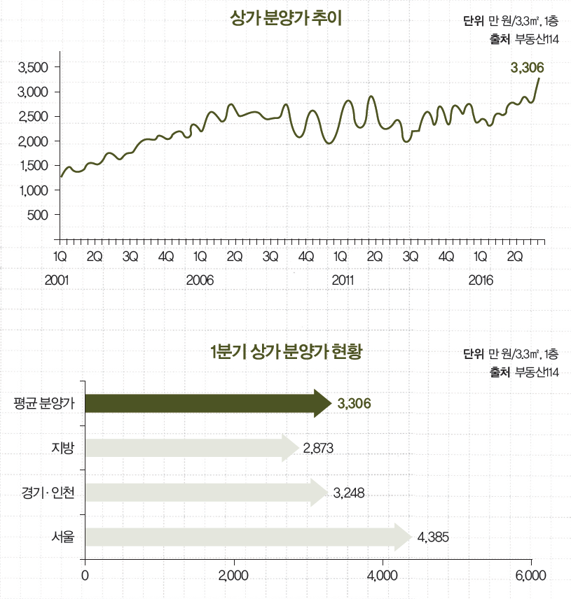 부동산114 따르면 올해 1·4분기 상가 평균 분양가가 역대 최고가인 3.3 ㎡당 3306 원으로 조사됐다. 이는 전년 동기 대비 22%가량 상승한 수치다. 특히 서울 논현동, 마곡동에서 7 단지가 3.3㎡당 평균 4385 원에서 공급되며 전체 분양가 상승에 영향을 것으로 분석된다. 경기·인천 (3248 /3.3) 남양주 다산, 하남 미사, 화성 동탄2신도시 등지에서 29 상가가 분양됐고 지방은 3.3㎡당 평균 2873 수준에서 공급됐다.