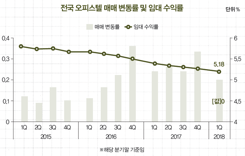 오피스텔 매매 가격도 지난 1분기 0.2% 상승했다. 분기 대비(0.33%) 상승폭은 축소됐지만, 0.2% 선을 유지했다. 입주물량 증가, 금리 인상, 규제 강화 악재가 겹쳤지만 가격 하락으로 이어지지는 않았다.