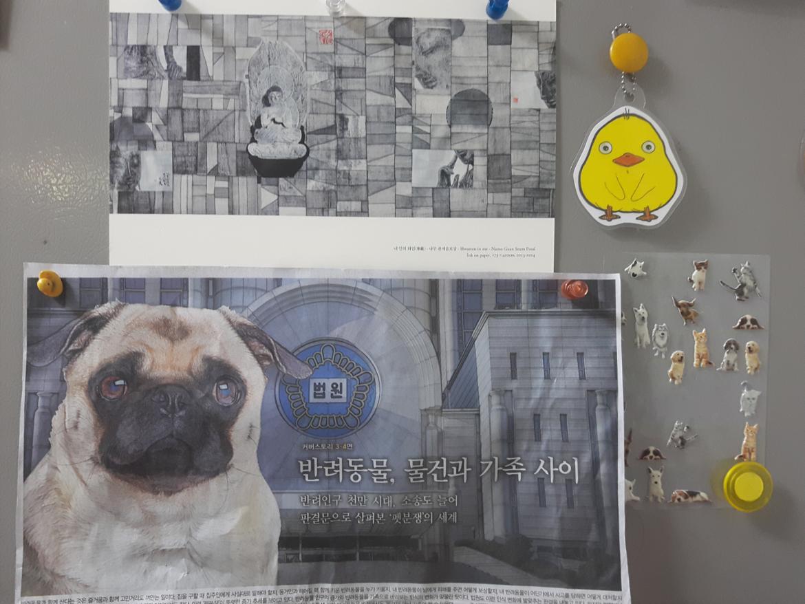 <신문 기사 반려동물 가족과 물건 사이에 실린 퍼그 견 사진. 떠났던 꼬동이가 돌아온 것 같아 오려 붙였다>