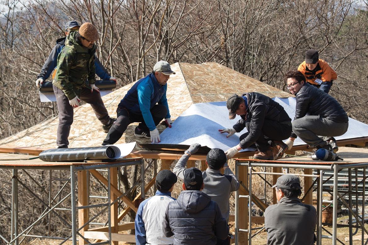 “종합과정은 공구 사용법 같은 기초 지식에서부터 거푸집 설치, 구들이나 골조의 구성, 설비나 전기까지 모든 부분을 가르칩니다. 이렇게 함께 배운 동기끼리는 SNS를 통해 지속적으로 소통하게 되는데, 안부만 묻는 것이 아니라 집 지을 때 서로 품앗이를 하는 전통이 생겼어요. 건축비의 상당 부분을 차지하는 인건비도 줄이고, 아는 사람들과 재미있게 지을 수 있다는 장점이 있기 때문이죠.”