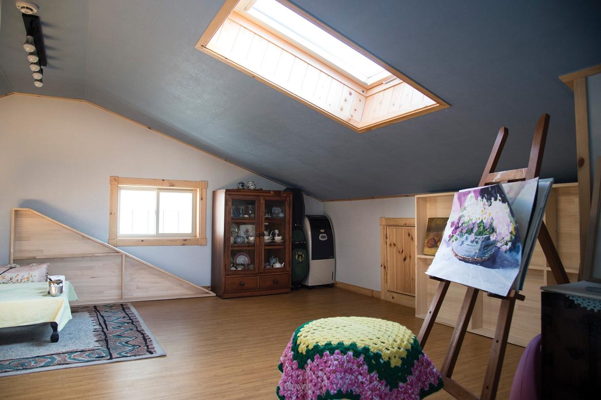 ▲천창이 달린 밝고 아늑한 분위기의 다락방. 밤에는 달과 별을 감상할 수 있다. 그림을 좋아하는 안주인 김경주
