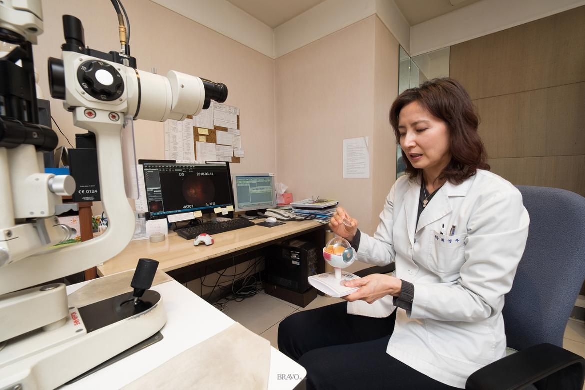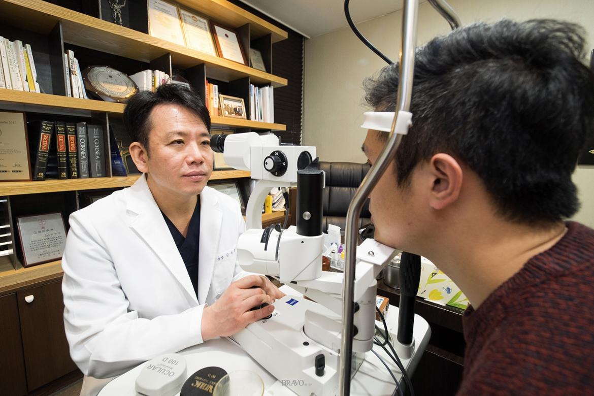 “최근 개원가를 중심으로 노안 치료를 위한 다양한 수술법이 시술됩니다만, 기본적으로 눈에 문제가 없는 정시(正視) 상태에서 노안이 왔다면 수술을 권하고 싶은 마음은 없습니다. 근시이거나, 백내장 질환이 있는 경우에는 질환을 치료하기 위한 수술 과정에서 노안치료를 함께 할 수 있습니다만, 그렇지 않은 경우라면 수술을 권하고 싶지 않습니다. 흔히 하는 얘기로 그 수술에 대해 평가하려면 의사도 그 수술을 받았는지 확인해 보라고 하잖아요? 저는 시력을 위해 라섹 수술은 받았지만, 가까운 곳을 볼 땐 돋보기를 낍니다.(웃음) 물론 안경이 싫어 수술을 고집하는 환자들도 많고 그들의 심정을 이해하지만, 돋보기보다 선명해지는 수술은 없고, 부작용이 따른다는 것을 명심해야 합니다.”