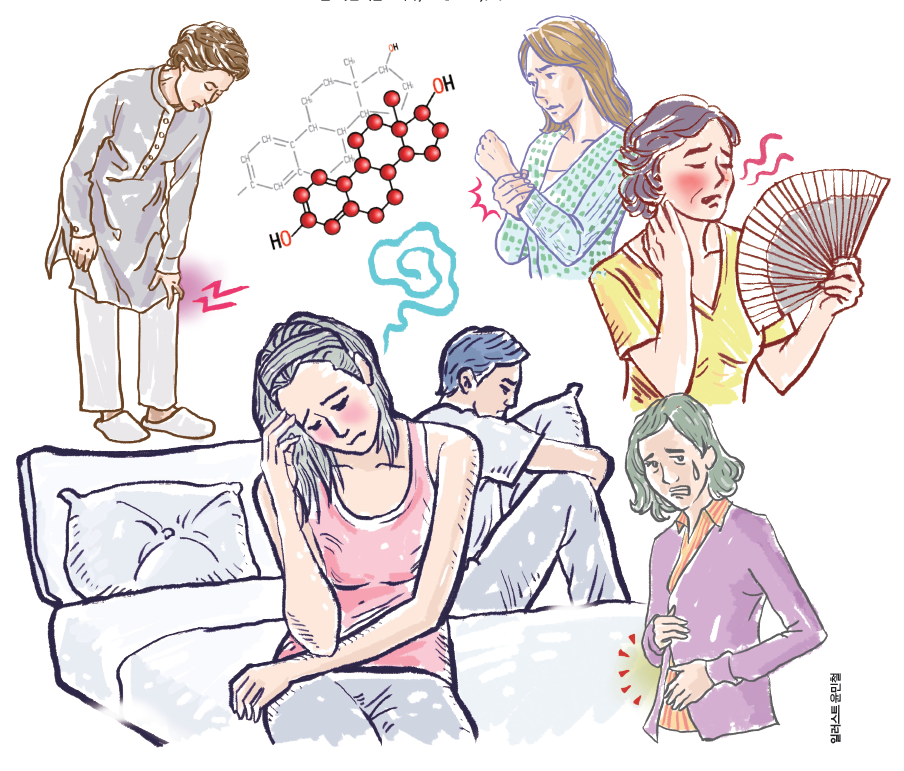 “이렇게 구분할 수 있지만 실제로는 증상이 복합적으로 나타나는 경우가 대부분입니다. 스무 가지가 넘는 증상을 호소하시는 분도 있어요. 또 한두 가지 증상 때문에 병원을 찾았다가 인지하지 못했던 다른 갱년기 증상을 찾아내기도 하죠. 증상을 방치하면 병이 심해집니다. 안면홍조를 제때 치료하지 않으면 사회생활에 문제가 생깁니다. 우울증으로 발전하기도 하고요. 관절통을 다스리지 못하면 퇴행성관절염으로 질환이 확대됩니다.”