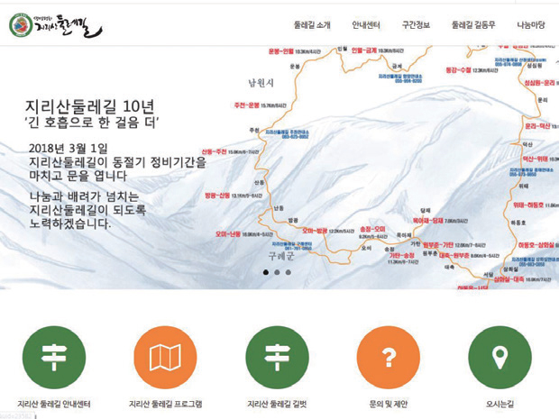 지리산둘레길은 전북, 전남, 경남을 아우르며 남원, 구례, 하동, 산청, 함양의 21개 읍면 120여 마을을 잇는 길이다. 웹사이트를 통해 총 22개 구간으로 나뉜 코스의 지도, 거리, 예상시간, 난이도뿐만 아니라 해발고도까지 있다. 더불어 주요 경유지와 안내센터 전화번호, 민박 정보, 마을회관 전화번호 등을 제공한다.