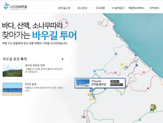 강릉바우길은 백두대간에서 경포와 정동진까지 산맥과 바다를 함께 걷는 총 400km의 코스다. 산맥에서 바다로 나아가는 길이 대부분이라 경사가 높지 않아 초보 여행자들에게 부담이 덜한 편이다. 사이트에서는 코스별 지도, 교통정보, 준비물을 비롯해 길마다 히스토리를 담은 ‘스토리텔링’ 콘텐츠까지 있다.