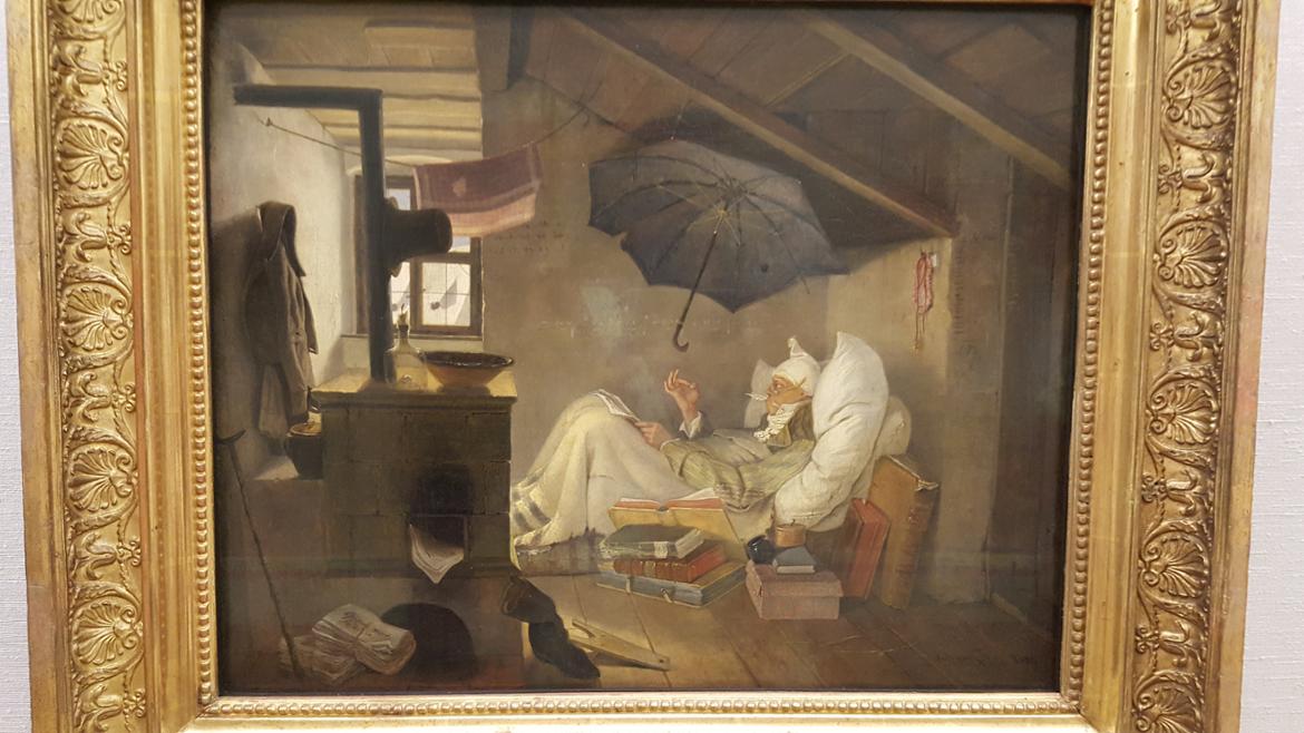 뮌헨 박물관에서 그림 한 점에 발길을 멈추고 잠깐 생각에 잠겼다. 칼스피츠베그(Carl Spitzweg)의 가난한 시인(Der arme Poet)으로 1930년대 독일 민중의 삶을 나타낸 그림이었다. 좁고 낡은 집 천장에 비가 새는지 우산을 받쳐놓았고, 땔감은 보던 종이뭉치가 던져져 있지만 불을 때지는 않았다. 방안의 냉기가 느껴지듯 모자를 쓰고 두터운 잠옷을 입은 처지에도 시인의 침대 옆에는 책이 수북이 쌓여있다. 가난한 시인의 삶에서 그를 지탱해 주었던 것들이 고스란히 느껴지는 그림이다. 젊은 시절의 내가 이 그림을 보았다면 분명 남루한 모습의 시인이 불쌍하게 느껴졌을 텐데, 지금의 나에게는 왠지 그림 속 시인이 초라해 보이지 않는다.