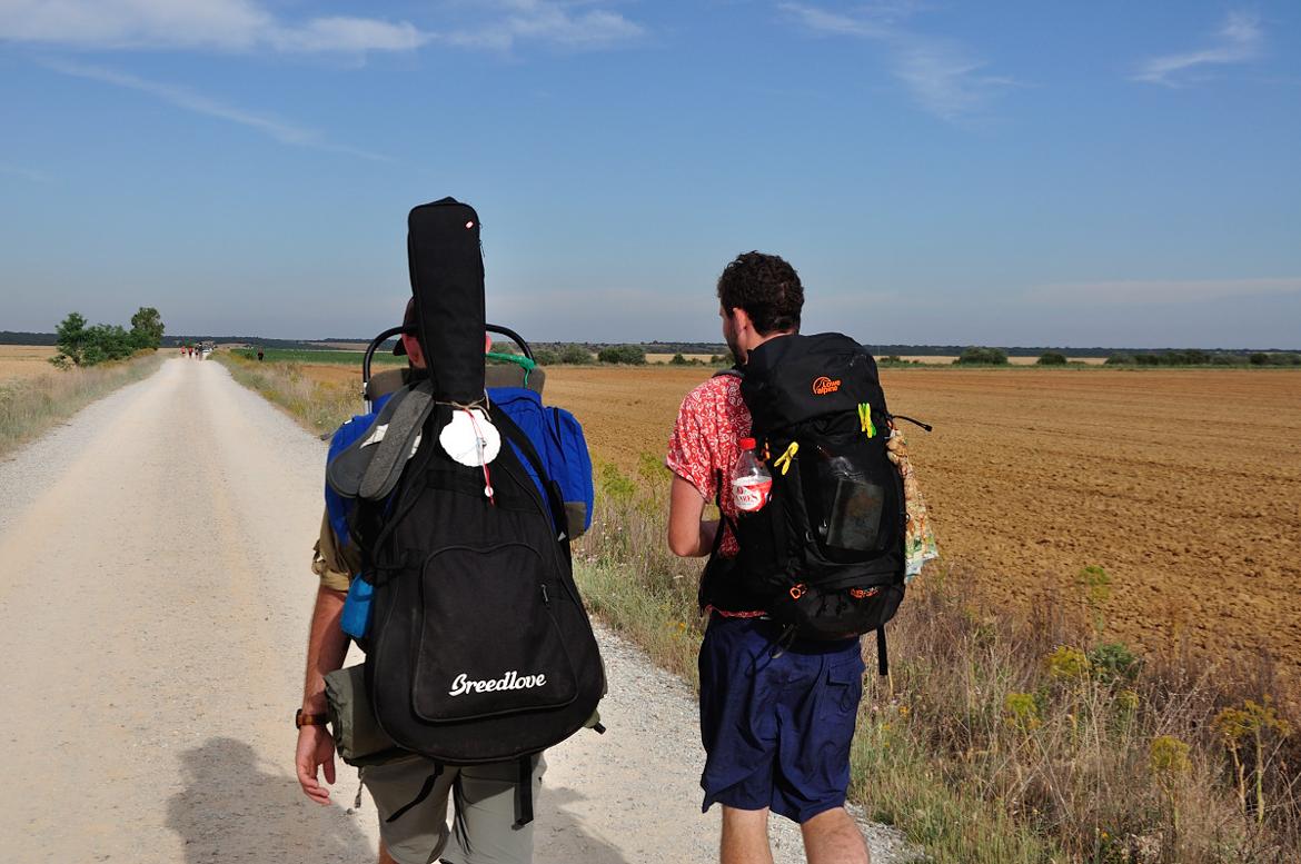 배낭 무게가 제한이 되다보니 배낭에 넣고 가야할 준비물도 최경량 또는 최소화 하려는 경향으로 흘러간다. 그러다 보니 옷 무게를 줄이기 위해 이런저런 고민을 하는 경우가 많은데 6월에 순례길에 가도 피레네산맥을 넘을때나 메세타평원 지역에서는 밤에 써늘하다. 얇은 바람막이점퍼로는 추위를 막기 어렵다. 그래서 아웃도어 자켓을 준비해야 하는데 이를 외면한다. 단순히 배낭이 무거워진다는 이유로... 또 어느 순례자는 순례길의 멋진 풍경을 찍기위해 새로 카메라와 렌즈를 준비했지만 포기했다. 왜냐하면 배낭무게가 1kg 이상 늘어났기 때문이다. 순례길 걷는 내내 아름다운 풍경을 보면서 가져오지 못한 카메라에 대한 아쉬움을 토로했다. 배낭 무게를 줄이겠다는 이유로 중간에 마을이 없는 곳을 지날 때 물과 간식거리를 준비하지 않은 일행도 있었다. 결국 내가 가져온 간식과 물을 나눠마셔야 했다. 과연 배낭 무게를 줄여서 내 즐거움의 무게까지 내려놓으면 그 순례길이 행복해진다고 확신할 수 있는지 묻고 싶다. 무겁더라도 자기가 가져가고 싶은 물건은 가져가는게 맞다고 본다. 외국의 순례자들은 카메라 뿐만 아니라 커다란 기타 또는 파티에 입을 여벌의 옷가지를 준비해 가는데 그들의 표정은 행복해 보이기만 한다.