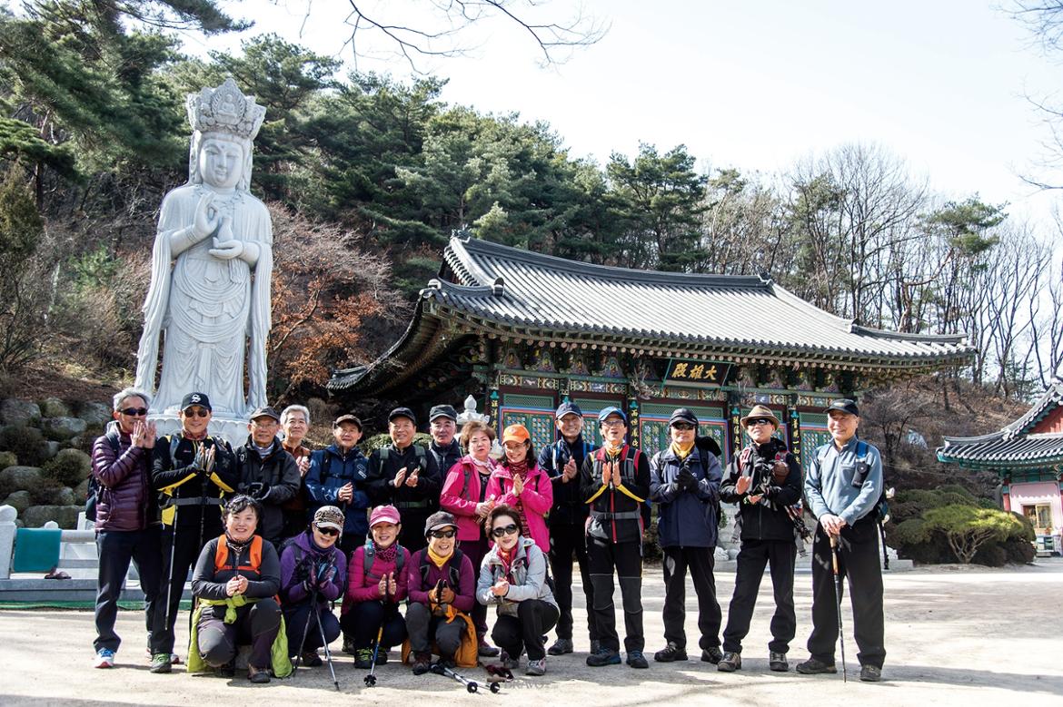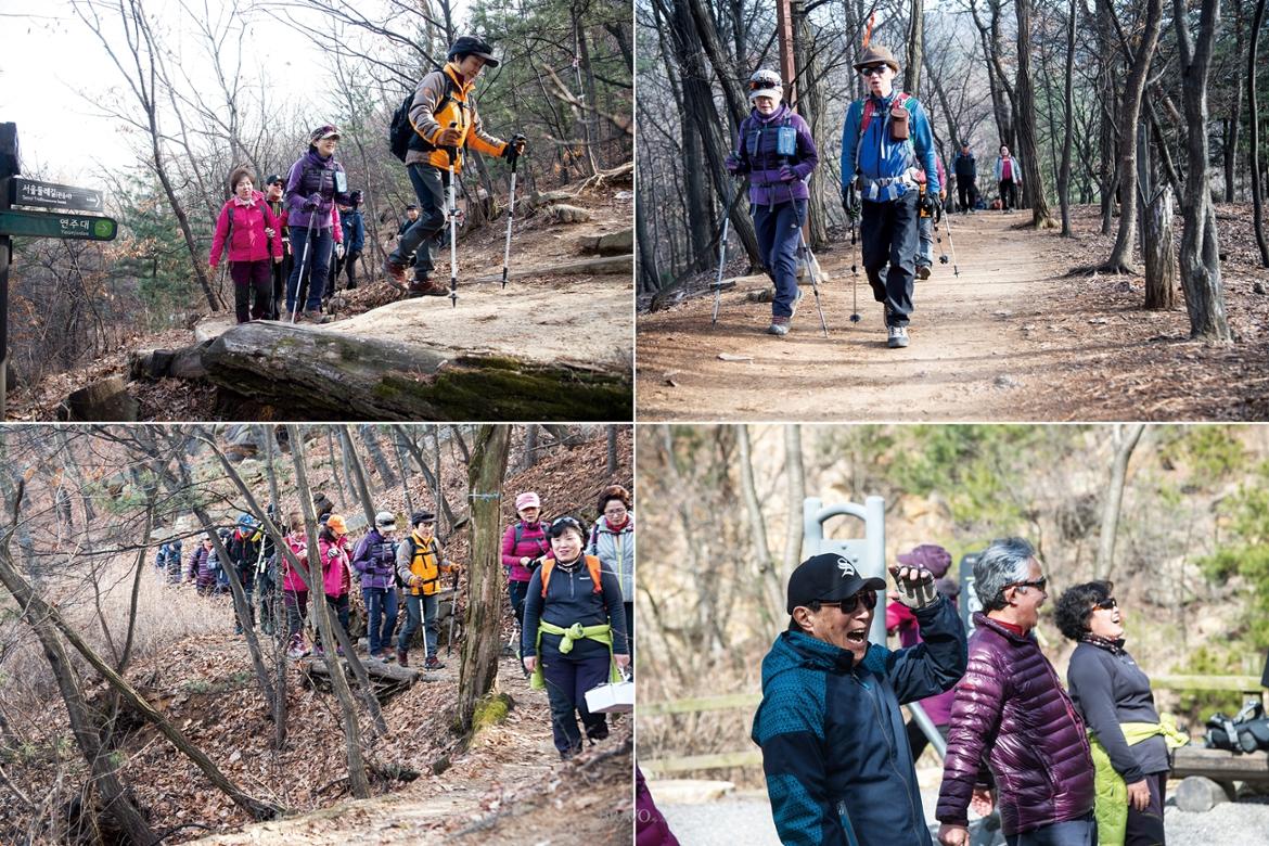 ▲60대 70대 회원이 주로 활동이 많은 프리맨 도보여행 회원들이 지난 3월 봄날 관악산에서 만났다.(대장 기윤