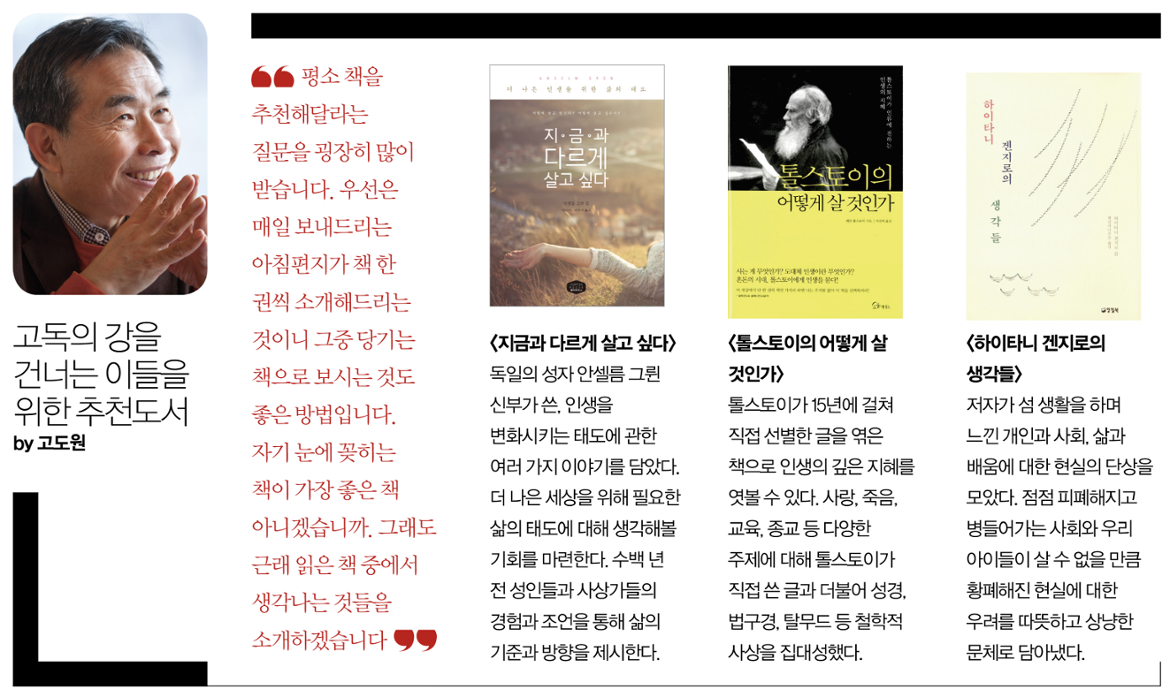 고 이사장은 예방주사를 맞듯 고독에도 훈련이 필요하다고 조언했다. 그래야 불시에 강물이 밀려오더라도 그 깊이를 짐작할 수 있기 때문이다. 강물의 깊이를 알면 두려움은 사라지고, 슬기롭게 고독의 순간을 넘기는 힘이 생긴다고.