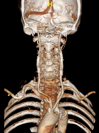 ▲최태현씨의 수술후 3D CT 촬영 사진. 목 부위 혈관에 두드러진 부분이 삽
