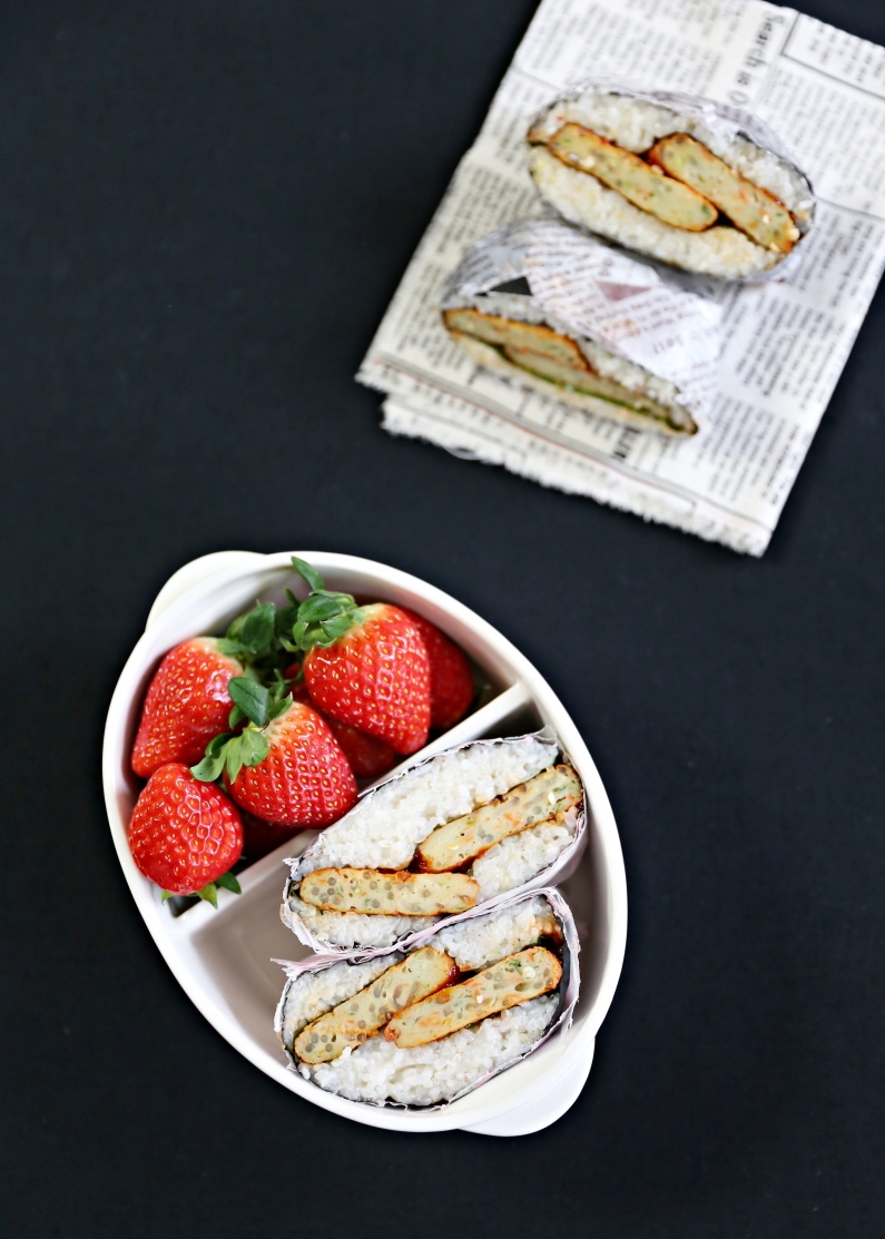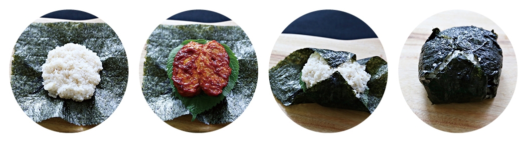 만드는 방법 네모난 김 위에 동그랗고 납작하게 밥을 올리고 그 위에 어묵, 깻잎을 올린다. 그 위에 밥을 다시 얹고 김의 네 귀퉁이를 접어 주먹밥처럼 만든 후 반으로 자른다. 어묵 외에도 볶음김치, 참치마요네즈, 오징어채볶음 등을 넣어 응용할 수 있다.