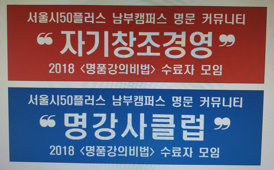 서울시50플러스 남부캠퍼스에서 1학기 <명품강의 비법>을 수강한 수료자들이 '자&명 커뮤니티'로 다시 뭉쳤다. '자&명'은 '자기창조경영'과 '명강사클럽'의 줄임말로 명강사클럽이 지금까지 가지고 있던 지식과 경험을 나누는 것이라면, 자기창조경영은 이 지식과 경험을 서로 공유하고 어우러져 새로운 콘텐츠를 만들어나가자는 취지다. 이처럼 자&명은 '따로 또 같이'라는 목표를 세우고 함께 가는 방법을 토론하며 연구하기 위해 뭉친 커뮤니티다.