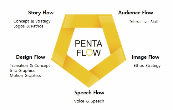 <명품강의 비법> 강좌는 예비 사회적 기업 에이지솔루션의 기획으로 이루어졌다. 수업은 강사가 갖춰야 할 다섯 가지 조건에 대해 핵심적으로 알려주었다. 그것이 바로 5가지 흐름, 펜타플로우(Penta-Flow)다. 펜타플로우란 Penta(5개)와 Flow(흐름)의 합성어다.