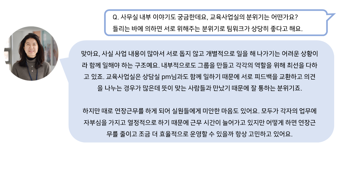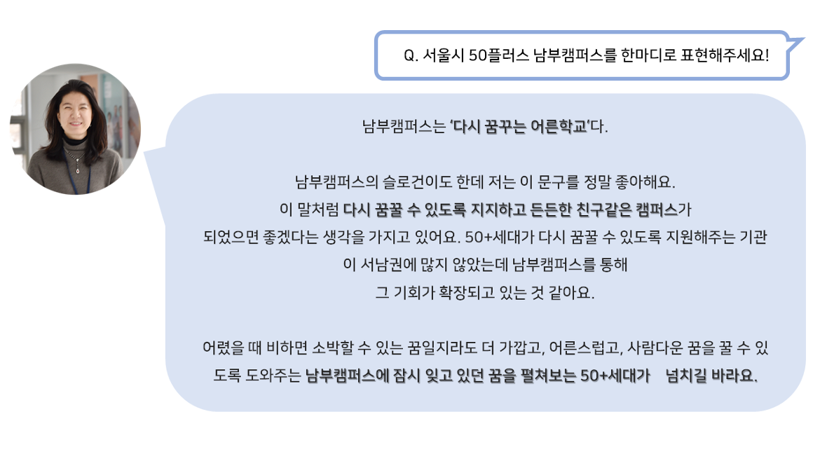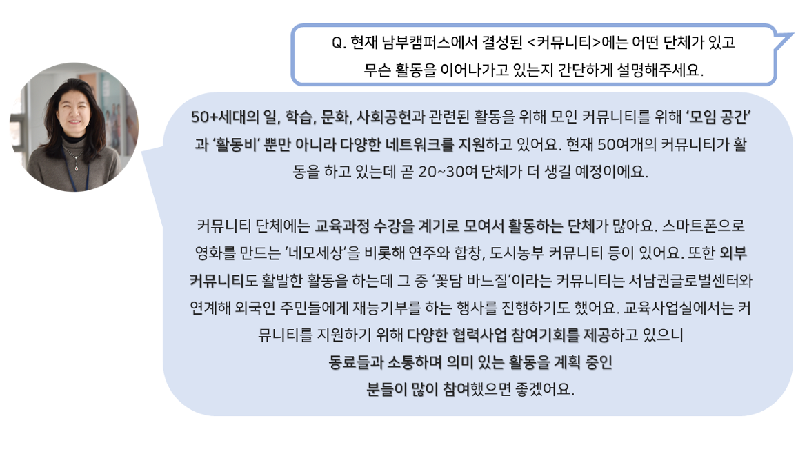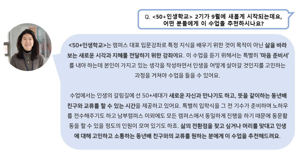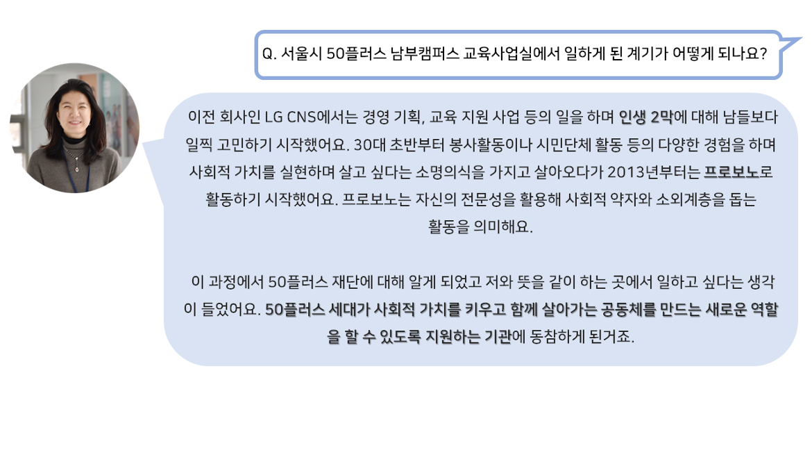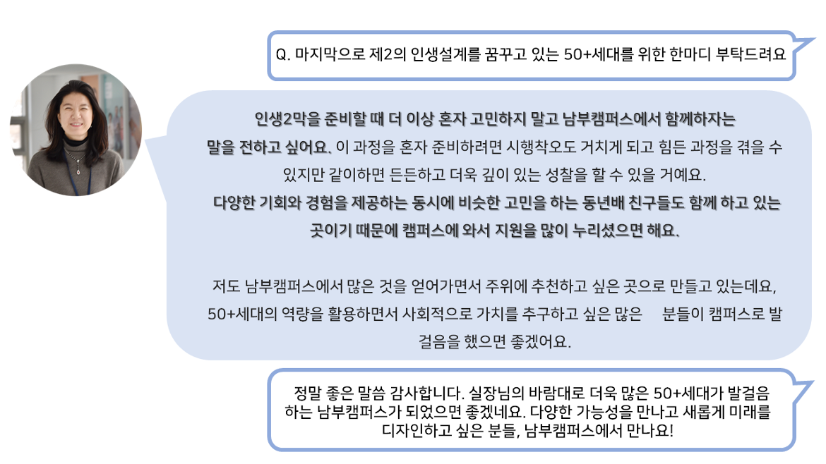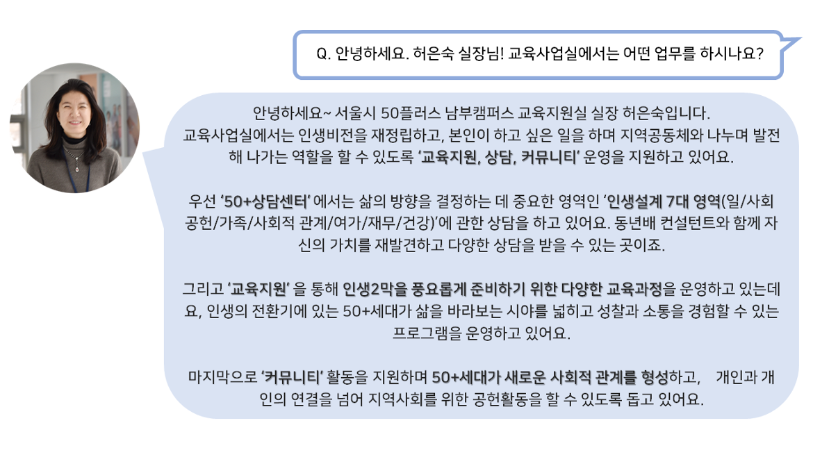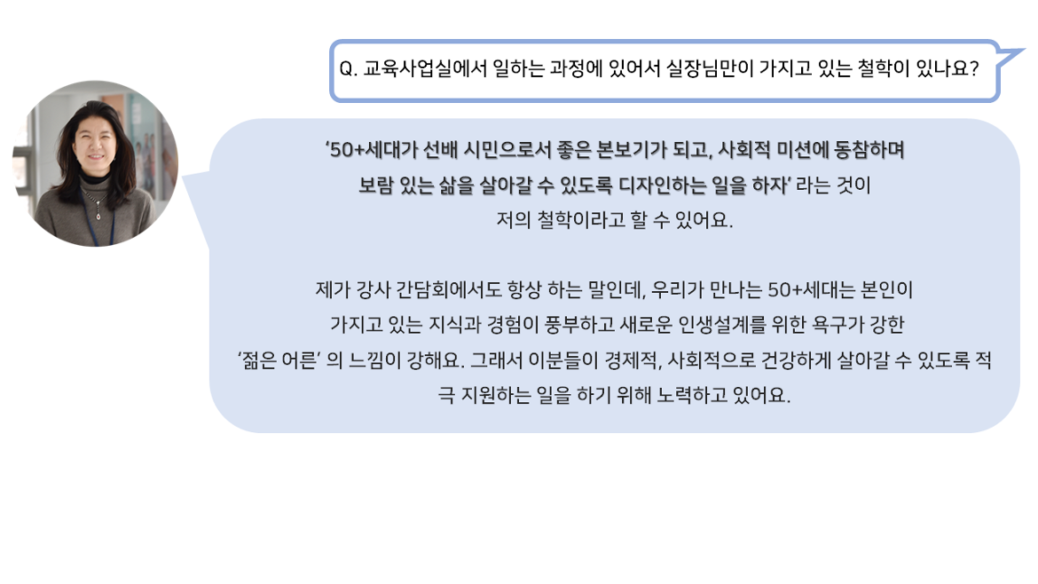 50+세대의 새로운 미래를 만들어가는 교육사업실 허은숙 실장님과 함께 더욱 자세한 이야기를 나눠보았습니다.