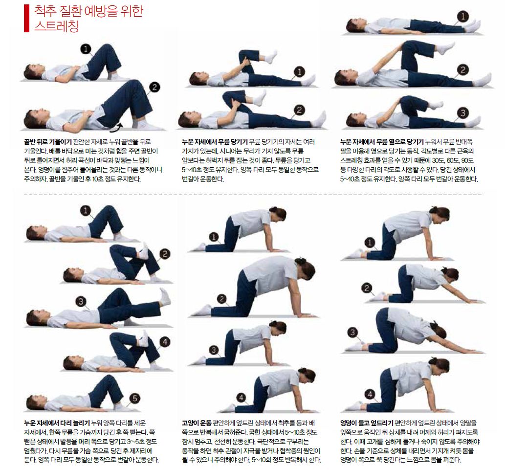 예방뿐만 아니라 척추 수술을 앞두고 혹은 수술을 하고 나서도 회복을 앞당기는 방법 역시 스트레칭이다. 유연성을 확보하고, 함께 나타나는 통증이 조절된 이후 시작하는 것이 기본. 약한 강도부터 시작해 조금씩 강도를 높여나가야 하고, 운동 방식은 환자의 상태에 따라 결정해야 한다. 때문에 운동을 시작하기 전에 전문의와 상담하는 것이 중요하다.