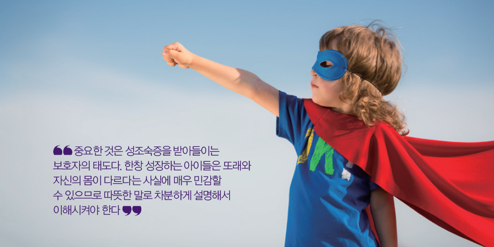 그러나 무엇보다 중요한 것은 성조숙증을 받아들이는 보호자의 태도다. 한창 성장 하는 아이들은 또래와 자신의 몸이 다르다 는 사실에 매우 민감할 수 있으므로 따뜻한 말로 차분하게 설명해서 이해시켜야 한다. 예를 들어 치료하지 않으면 빨리 월경을 시작해서 큰일이 난다거나 약을 먹지 않으면 키 성장이 멈춰버린다는 등의 겁주는 말은 위험하다. 그보다는 “보다 멋진 어른이 되 기 위해 지금 속도를 맞추는 과정”이라고 설명을 해주는 건 어떨까. 조숙한 신체를 갖게 된 아이들은 또래 집단의 시선에 예민 해질 수도 있으니 “달리기 해봤지? 친구들 보다 한 걸음 앞섰을 뿐이야, 곧 친구들도 따라올 거야”라는 설명으로 아이가 마음의 상처를 받지 않도록 해줘야 한다.